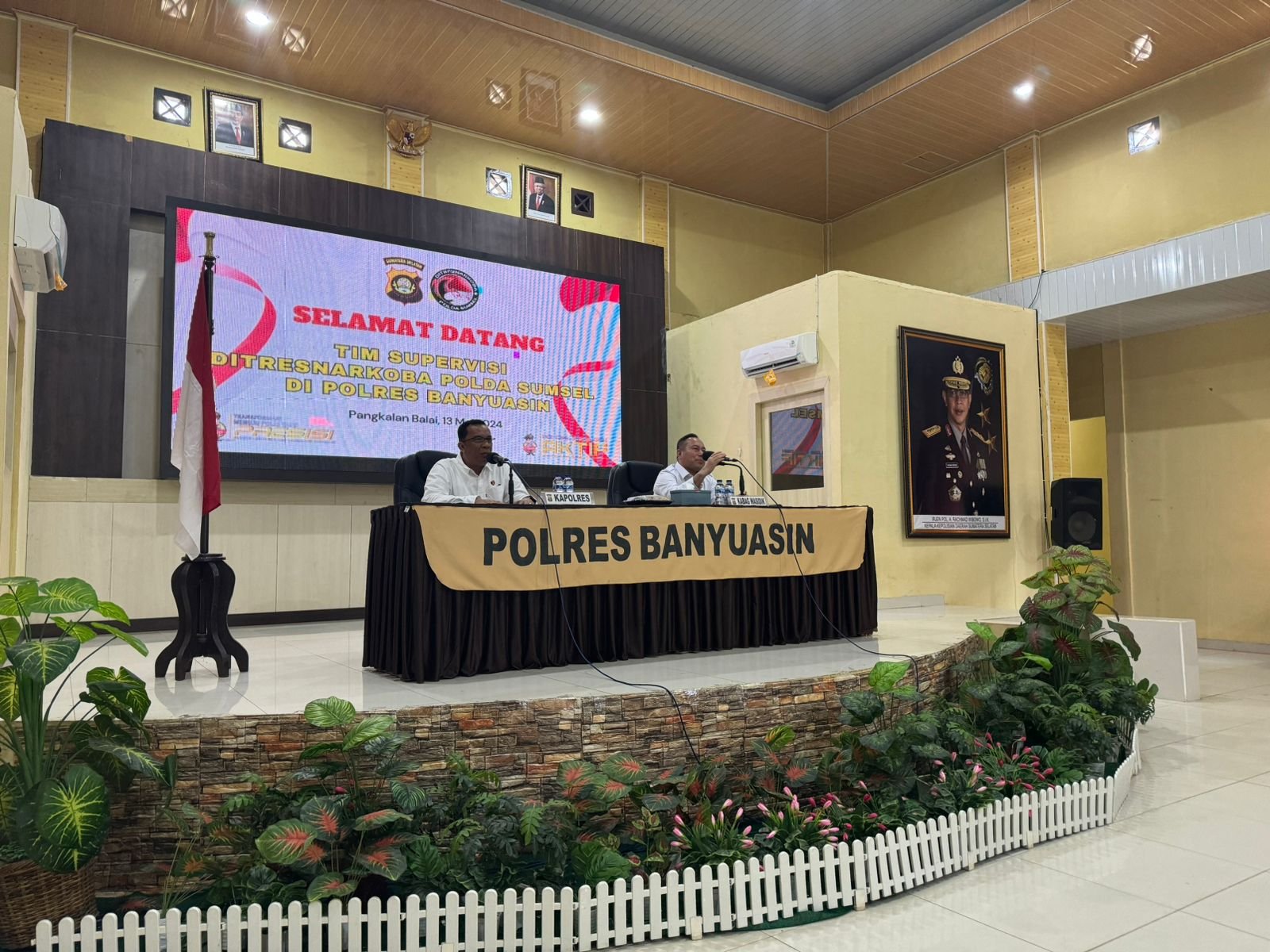 POLRES BANYUASIN,SRIWIJAYAPERTAMA.NET – Pada hari Senin 13 Mei 2024 menerima kunjungan dari tim supervisi Direktorat Reserse Narkoba (Resnarkoba) Polda Sumsel yang dipimpin oleh AKBP H Muhammad Syeh K ST SH MH selaku Kabag Wassidik Ditresnarkoba Polda Sumsel di Aula Sanika Satyawada