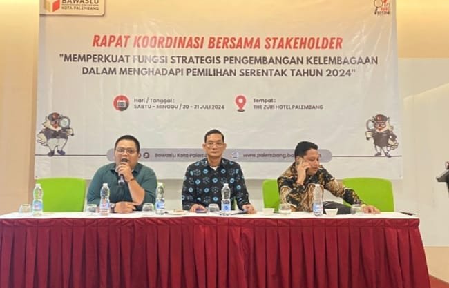 Palembang.sriwijayapertama.net – Badan Pengawasan Pemilihan Umum (Bawaslu) Kota palembang gelar Rapat Koordinasi (Rakor) bersama stakeholder, secara resmi dibuka oleh Ketua Bawaslu Kota Palembang, Yusnar SSos.I di Ballroom The Zuri Hotel Jalan Radial Kecamatan Bukit Kecil Kota Palembang, Sabtu (20/7/2024).