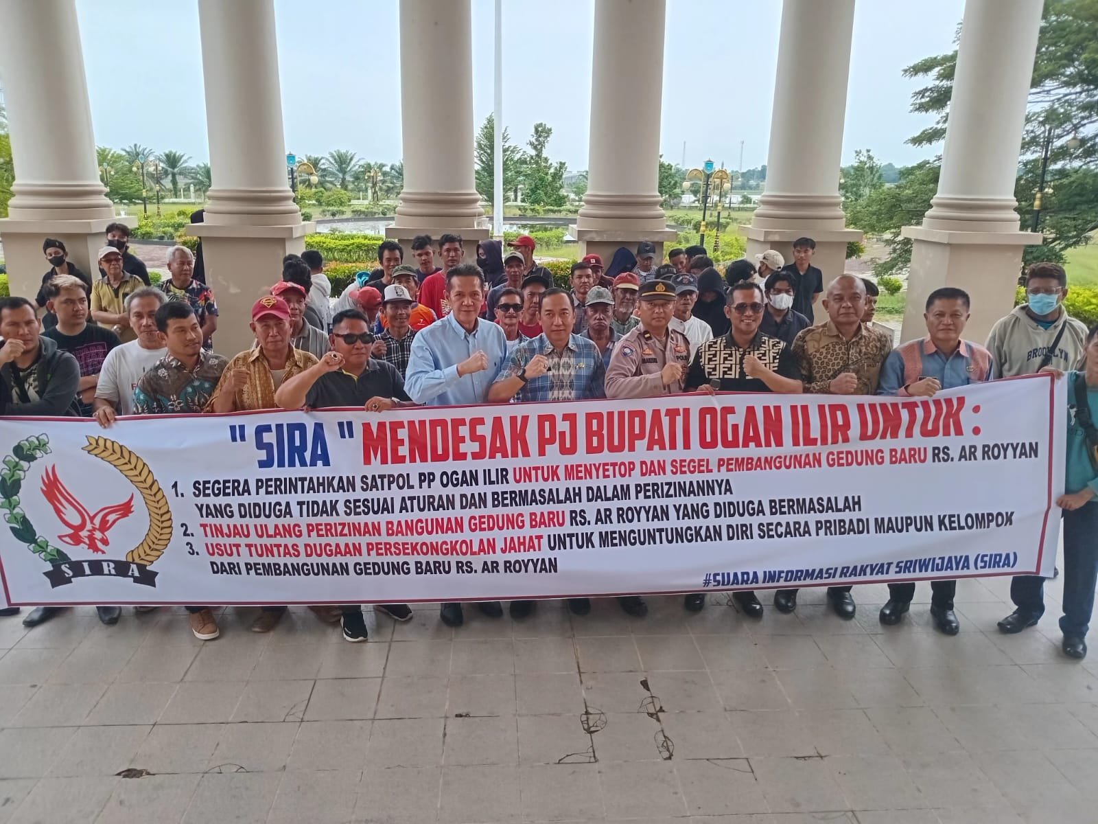Dalam pengawalan ketat pihak Kepolisian dan Satpol PP, unjuk rasa di pimpin langsung oleh Direktur Eksekutif Lembaga SIRA Rahmat Sandi Iqbal, SH di dampingi Sekretaris Eksekutif Rahmat Hidayat, SE dalam orasinya menyampaikan, adanya dugaan permasalahan yang di anggap perlu menjadi perhatian khusus oleh PJs Bupati Ogan Ilir terkait pembangunan gedung baru di RS Ar Royyan yang diduga bermasalah serta tidak sesuai ketentuan.