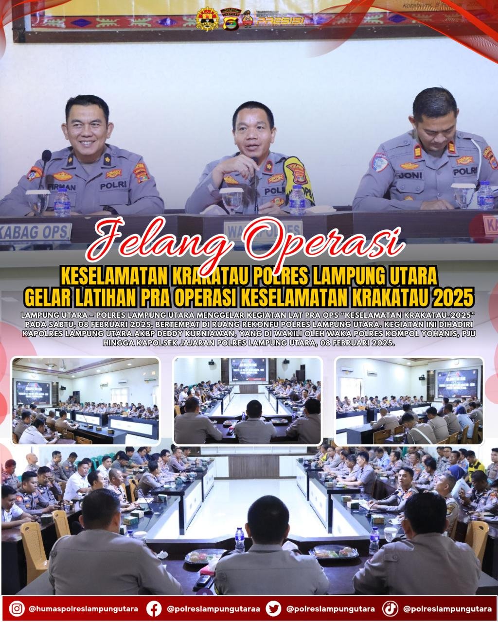 Polres Lampung Utara menggelar kegiatan Lat Pra Ops “Keselamatan Krakatau-2025” pada Sabtu, 08 Februari 2025, bertempat di Ruang Rekonfu Polres Lampung Utara. Kegiatan ini dihadiri Kapolres Lampung Utara AKBP Deddy Kurniawan, yang di wakili oleh Waka Polres Kompol Yohanis, PJU Hingga kapolsek Jajaran Polres Lampung Utara, 08 Februari 2025.