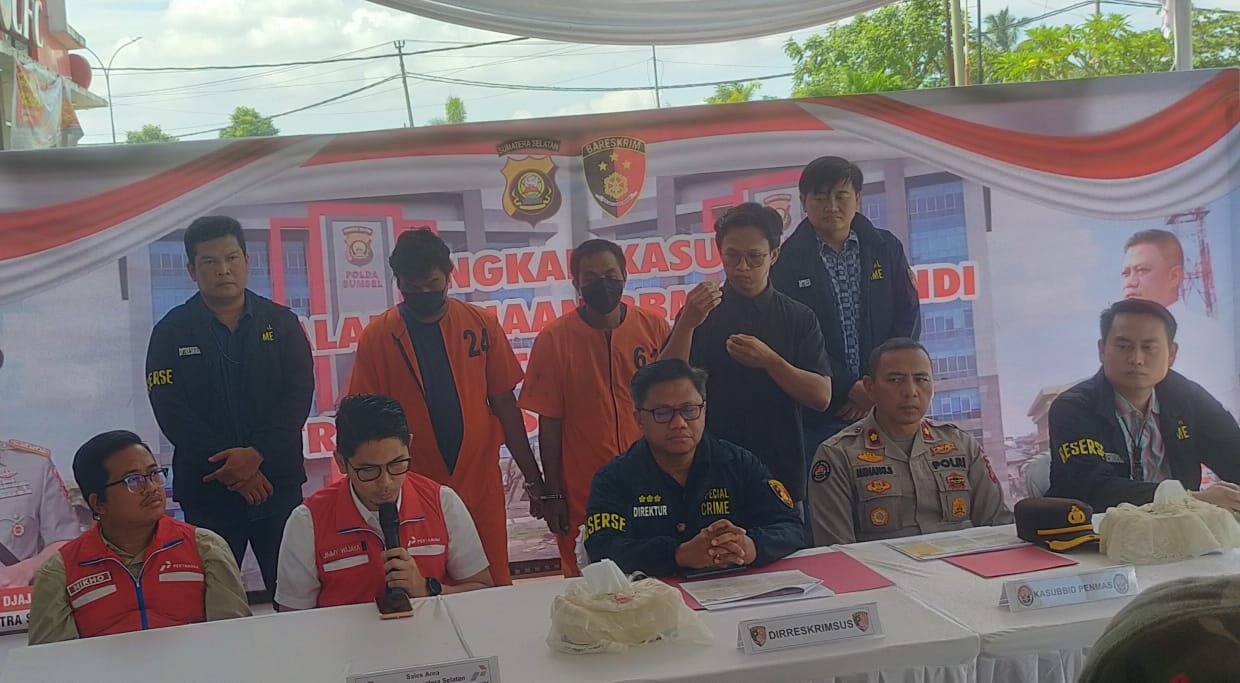Konferensi pers tersebut dipimpin Direskrimsus Polda Sumsel, Kombes Pol Bugus Suropratomo Oktobrianto dan dihadiri oleh Kaur Pensat Subbid Penmas Bidang Humas Polda Sumsel Kompol Menang S dan Sales area manager Sumsel PT Pertamina Patra Niaga, Jimmy Wijaya.
