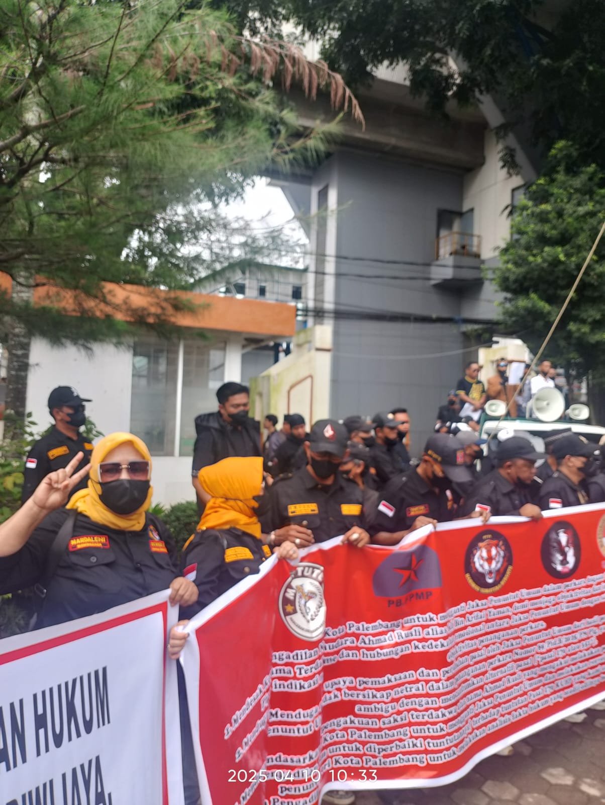 PALEMBANG ,SRIWIJAYAPERTAMA.NET –– Ratusan massa yang tergabung dalam aliansi beberapa organisasi masyarakat (Ormas), yakni Dewan Pimpinan Pusat (DPP) Harimau Sumatera Bersatu (HSB), Macan Tutul, FPGSS, MSK.Indonesia, dan PB.FPMP, menggelar aksi unjuk rasa di halaman Kantor Pengadilan Negeri (PN) Kelas I Kota Palembang, Kamis (10/04/2025).
