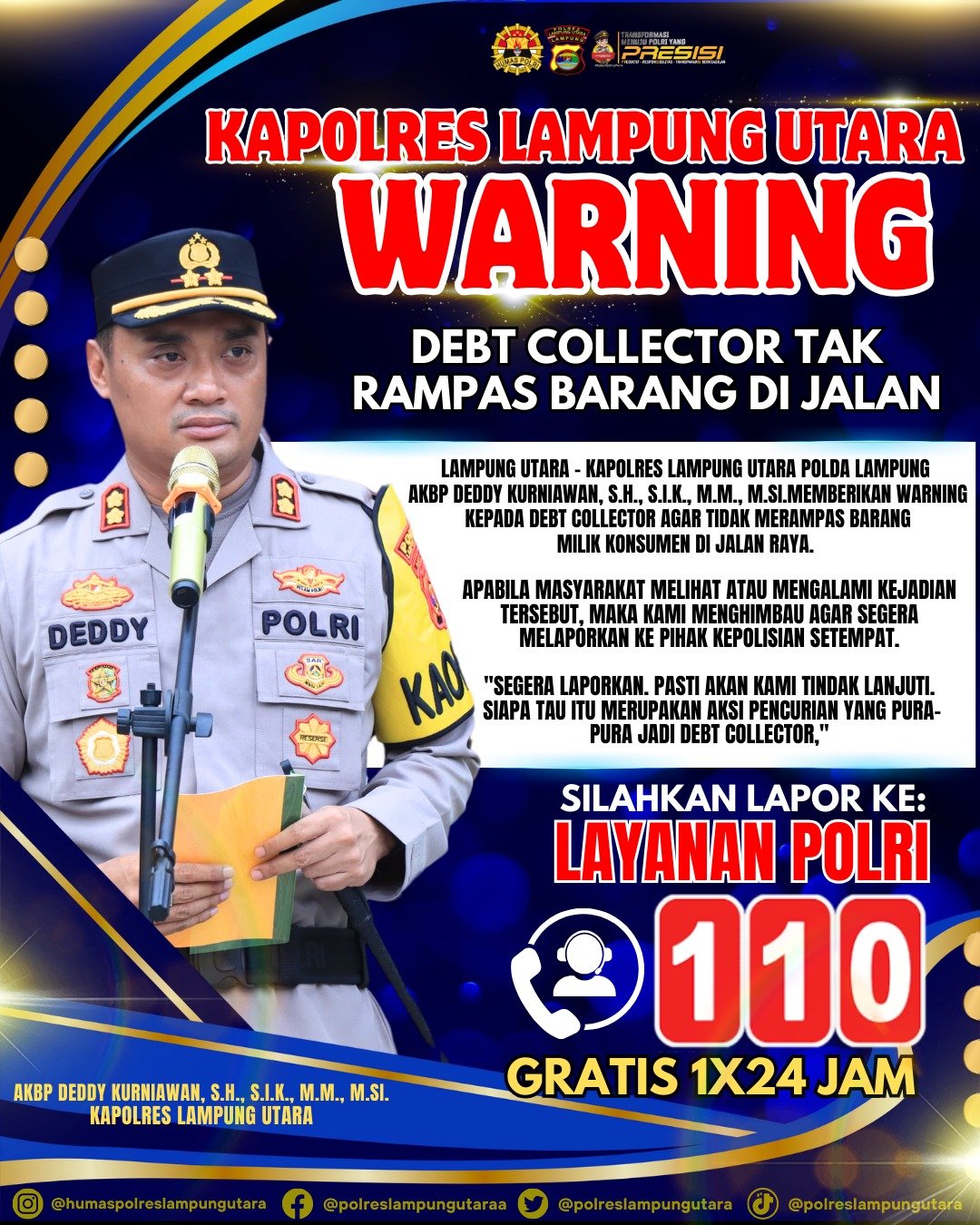 Lampung Utara |Sriwijaya Pertama.Net – Kapolres Lampung Utara Polda Lampung AKBP Deddy Kurniawan, S.H., S.I.K., M.M., M.Si.memberikan warning kepada Debt Collector agar tidak merampas barang milik konsumen di jalan raya.
