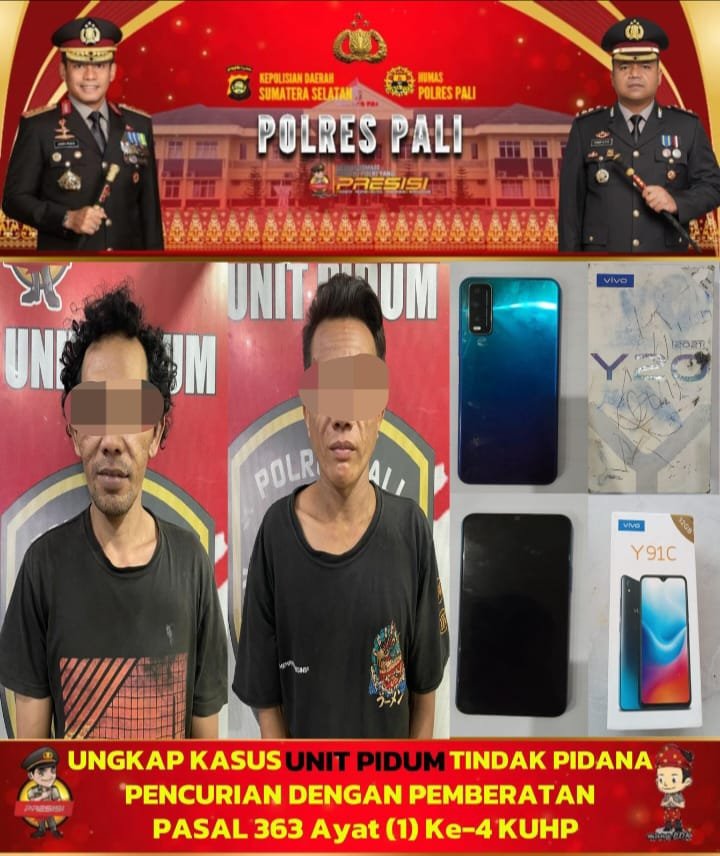 Dua Pelaku pencurian handphone di sebuah Warung jalan Servo Lintas Raya KM 62 Desa Talang Bulang, Kecamatan Talang Ubi Kabupaten PALI dibekuk jajaran Satuan Reserse Kriminal Polres PALI.