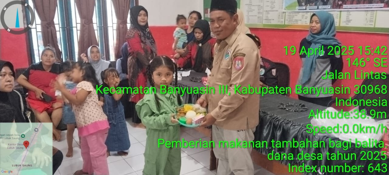 Banyuasin, SriwijayaPertama.net — Pemdes lubuk saung melalui kader posyandu, merealisasikan anggaran Dana Desa (DD) 2025, dengan memberikan makanan tambahan untuk balita, kecamatan Banyuasin lll kabupaten Banyuasin, Sabtu(19/4/2025).