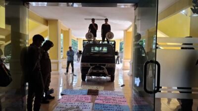 Banyuasin, Sriwijayapertama.net — Masa Aliansi Masyarakat Peduli Banyuasin (AMPB) mendatangi kantor Dinas PUPR Banyuasin sekaligus Gedung DPRD Banyuasin, dugaan penyalahgunaan realisasi anggaran APBD Tahun 2023-2024, Senin (28/4/2025)