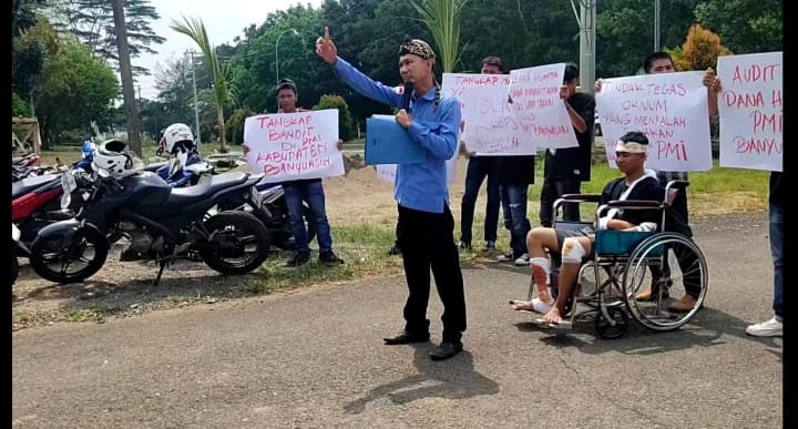Budi Setiawan selaku Kordinator Aksi dibersamai Doni AR sebagai korlap dalam orasinya mendesak Kejari Banyuasin sesegera mungkin menetapkan tersangka jika memang terbukti ada “menilap” Anggara dana hibah PMI Banyuasin.