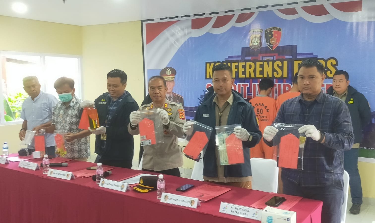 Konferensin pers dipimpin oleh Wakil Direktur Ditreskrimsus Polda Sumsel, AKBP Listiyono SIK, MH didampingi Kasubdit IV Tipidter AKBP Ahmad Budi Martono SIK MH dan dihadiri Kasubbid PID Penmas Bidang Humas Polda Sumsel AKBP Suparlan SH dan perwakilan PT Pertamina Patra Niaga di Ruang Konferensi Pers Gedung Presisi Mapolda Sumsel, Selasa (6/5/2025).