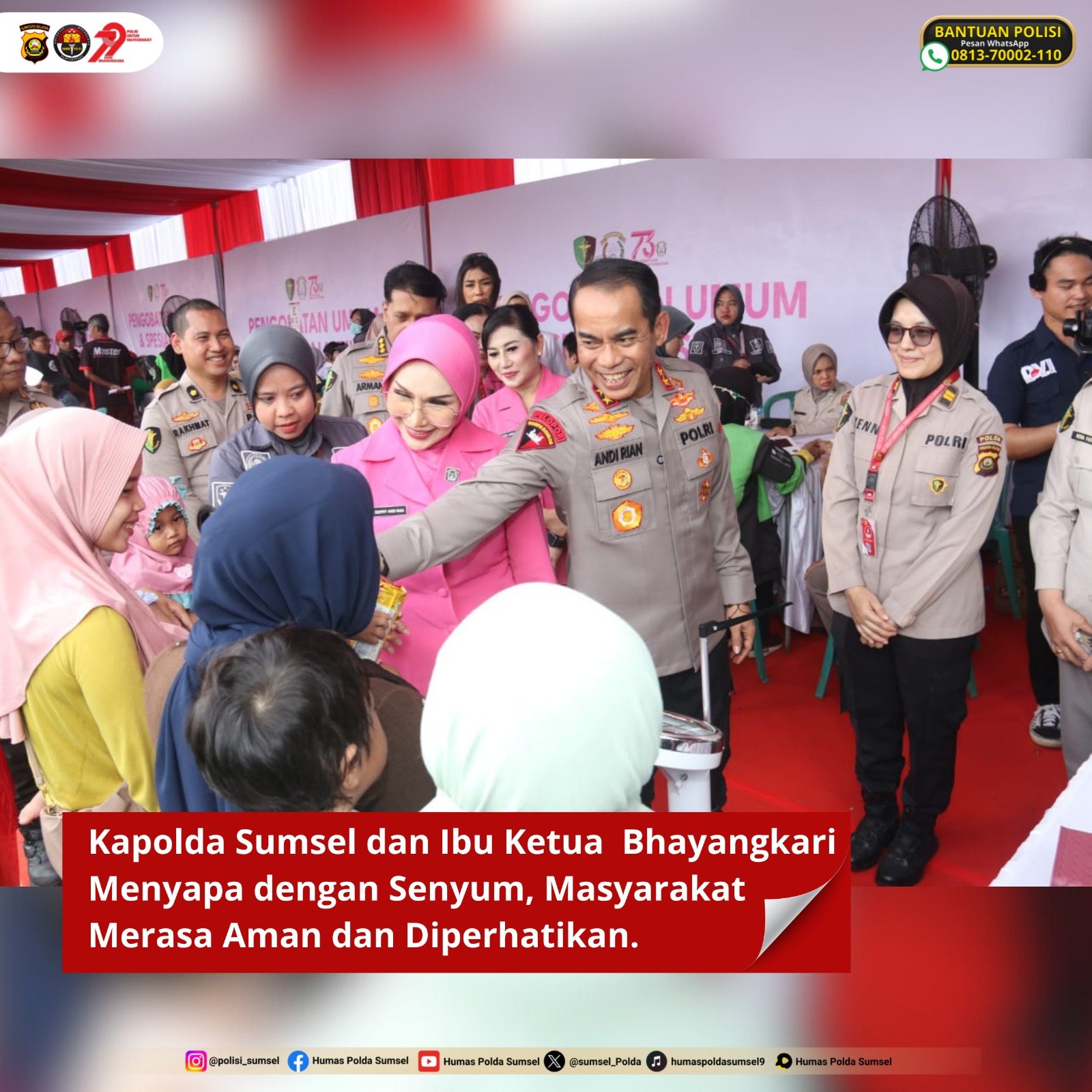 “Kegiatan ini adalah bentuk nyata kepedulian dan pelayanan kami terhadap masyarakat. Kami ingin Polri, khususnya Polda Sumsel dan jajaran, terus hadir memberikan manfaat, sebagaimana semangat tema Hari Bhayangkara ke-79: Polri untuk Masyarakat,” ujar Irjen Pol Andi Rian.