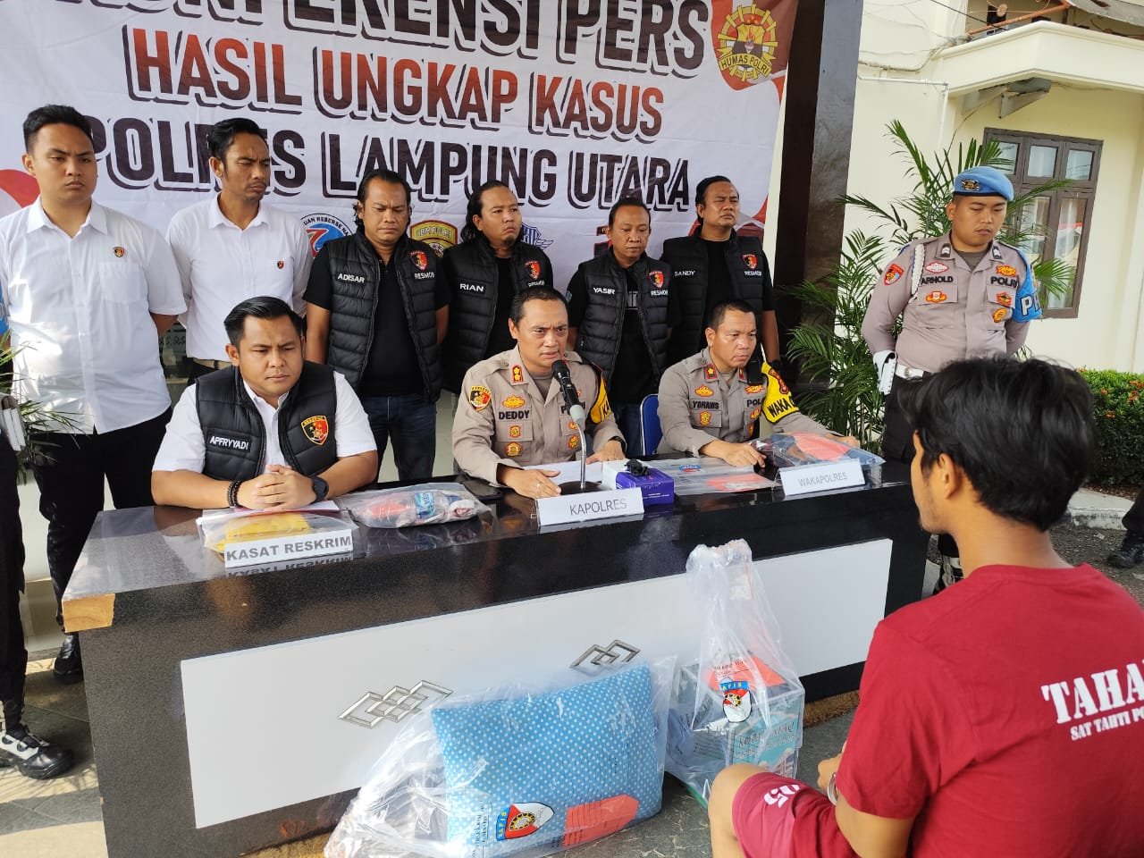 Kapolres Lampung Utara AKBP Deddy Kurniawan didampingi Waka Polres Kompol Yohanis dan Kasat Reskrim AKP Apfryyadi dalam Konferensi Pers di Halaman Mapolres, Senin (11/8/2025), mengatakan Tekab 308 Polda Lampung yang diback up Ditreskrimum Polda Lampung berhasil mengungkap kasus pembunuhan yg diawali pemerkosaan dan pencurian dengan kekerasan terhadap seorang karyawati warung sate di Desa Negara Tulang Bawang.