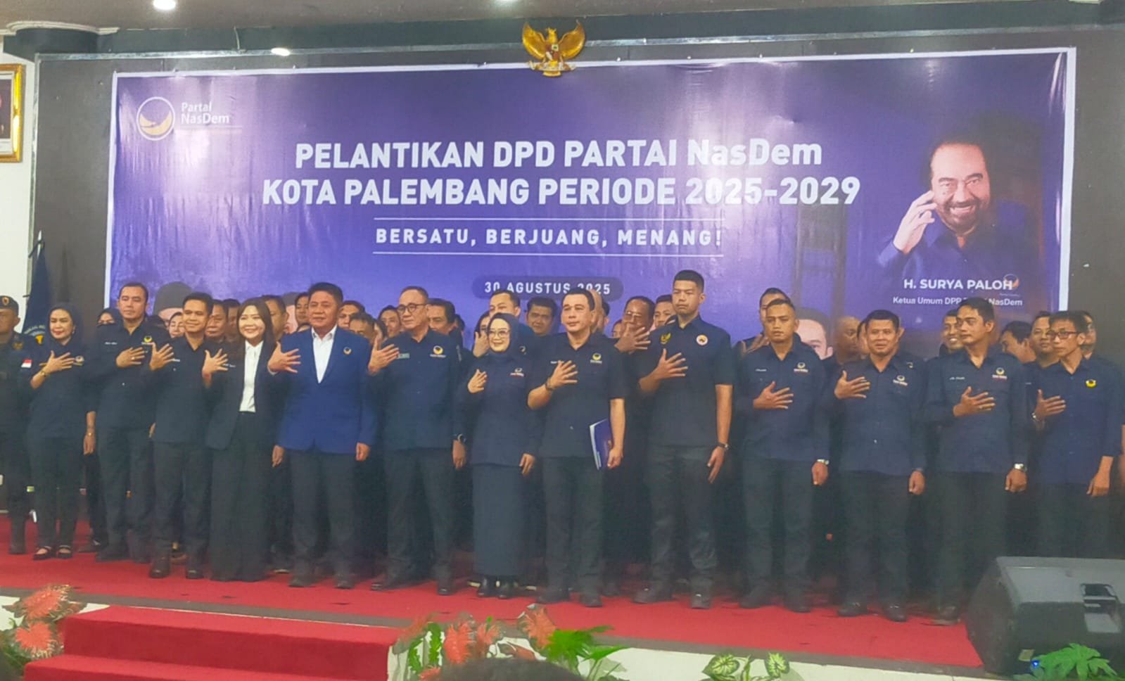 Palembang.sriwijayapertama.net – DPD Partai Nasdem Kota Palembang, gelar pelantikan pengurus Pergantian Antar Waktu (PAW) yang dilantik oleh Ketua DPW Nasdem Sumatera Selatan (Sumsel) H Herman Deru di Ballroom Hotel Swarna Dwipa Jalan Tasik Kecamatan Bukit Kecil Kota Palembang, Sabtu (30/8/2025).