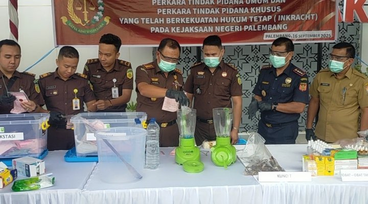 Pemusnahan barang bukti tersebut digelar di Halaman Kantor Kejari Palembang Jalan Gubernur H A Bastari Kecamatan Jakabaring Kota Palembang Provinsi Sumatera Selatan, Selasa (16/9/2025).