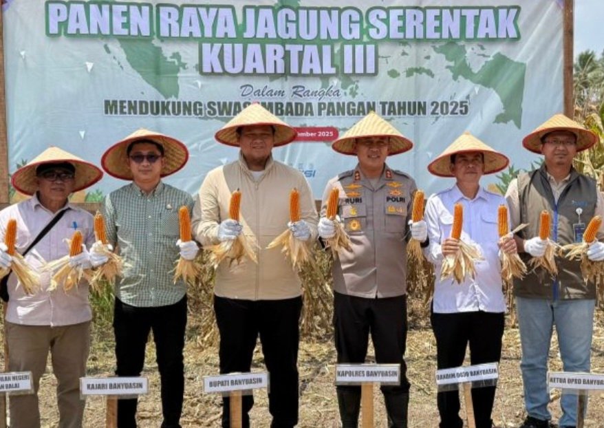 Tanjung Lago, SriwijayaPertama.net — Dalam rangka gugus tugas Polri mendukung ketahanan pangan di Kabupaten Banyuasin, Mewakili Bupati Banyuasin, Sekretaris Daerah Banyuasin, Ir. Erwin Ibrahim, ST., MT., MM., MBA., IPU., ASEAN.Eng bersama Kapolres Banyuasin, AKBP. Ruri Praswoto, SH., S.IK., M.IK melakukan Panen Jagung Serentak Kuartal III di Desa Sukatani, Kecamatan Tanjung Lago, Sabtu (27/09/2025).