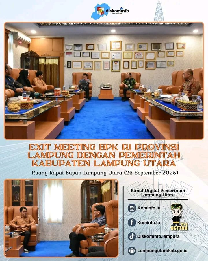 Kotabumi || SriwijayaPertama.net – Pemerintah Kabupaten Lampung Utara melaksanakan Exit Meeting bersama Badan Pemeriksa Keuangan (BPK) RI Perwakilan Provinsi Lampung pada Jumat, 26 September 2025, bertempat di Ruang Tamu Bupati Lampung Utara.