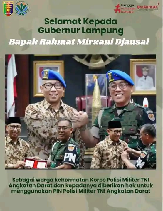 Sebagai bentuk apresiasi atas dukungan Pemprov Lampung, Danpuspomad Mayjen TNI Eka Wijaya Permana menyerahkan piagam penghargaan kepada Gubernur Rahmat Mirzani Djausal sebagai warga kehormatan Korps Polisi Militer TNI Angkatan Darat dan kepadanya diberikan hak untuk menggunakan PIN Polisi Militer TNI Angkatan Darat.