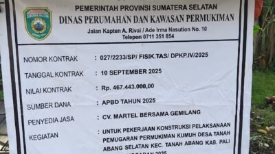 Proyek Pembugaran pemukiman kumuh yang bersumber dari APBD Provinsi Sumatera Selatan Tahun Anggaran 2025 ini dikerjakan oleh CV Martel Bersama Gemilang dengan nilai kontrak Rp.467.443.000,- (Empat Ratus Enam puluh tujuh juta Empat Ratus Empat Puluh Tiga Ribu Rupiah) dan masa pelaksanaan 90 hari kalender sejak 10 September 2025.