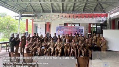 Banyuasin, Sriwijayapertama.net — Dinas Perkebunan dan Peternakan Kabupaten Banyuasin mengadakan Sosialisasi Pelaksanaan Banyuasin Bebas Rabies (BEBERES) Tahun 2028 di Kecamatan sembawa sebagai pilot projeck, yang dihadiri oleh Kepala UPTD Puskesmas Sembawa, Koordinator Balai Penyuluh Pertanian (BPP) Kecamatan Sembawa, seluruh Kepala Desa dan seluruh Penyuluh Pertanian serta Petugas Pendamping Teknis Peningkatan Produksi Peternakan (PPTPPP) di Kecamatan Sembawa. Selasa 14/10/2025