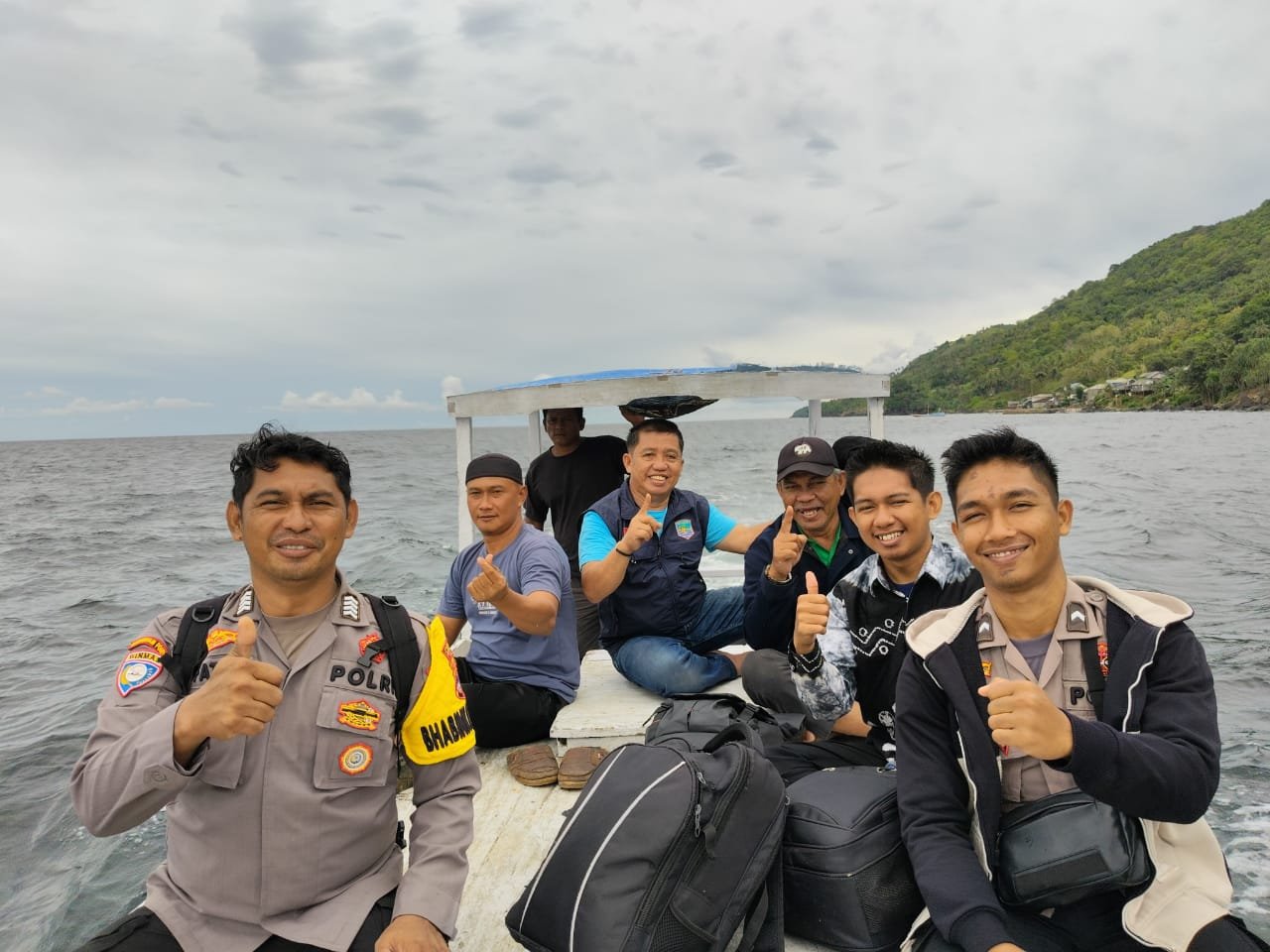 Anggota Polsek Pulau Sembilan bersama Camat Pulau Sembilan, Hamdi, S.Pd. dan staf Kecamatan, ketiganya rela mengarungi lautan dengan menggunakan sarana transportasi tradisional, kapal kelotok.