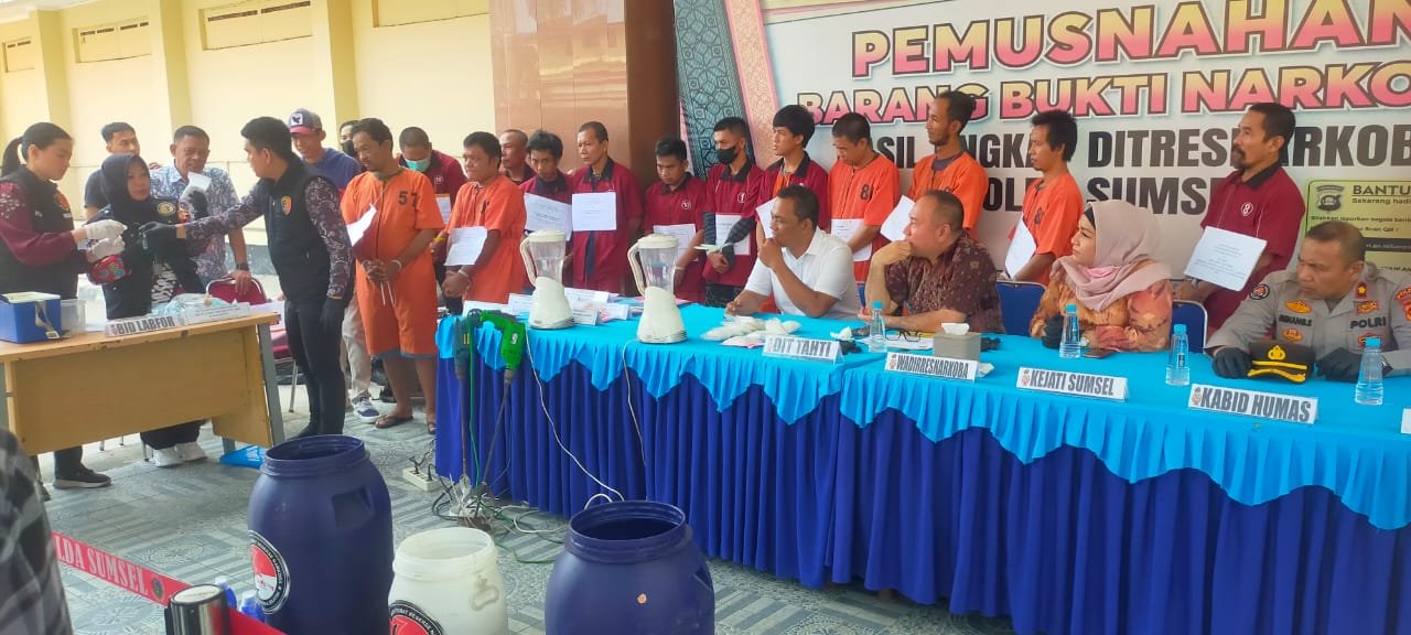 Pemusnahan tersebut dipimpin oleh Plt Wadir Ditresnarkoba Polda Sumsel, AKBP H M Syeh Kopek ST SH MH, yang didampingi Kaur Pensat Bidang Humas Polda Sumsel, Kompol S Menang serta dihadiri perwakilan Kabid Propam Polda Sumsel dan Ketua DPD YGANN Sumsel, Sri Harmilawati