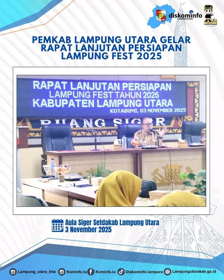 Kotabumi || SriwijayaPertama.net – Pemerintah Kabupaten Lampung Utara menggelar rapat lanjutan persiapan Lampung Fest Tahun 2025 di Ruang Siger Setdakab. Lampung Utara, Senin 3 November 2025.