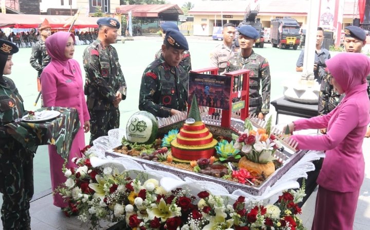 Prosesi pemotongan tumpeng oleh Kapolda Sumsel, menjadi puncak acara syukuran yang diserahkan kepada perwakilan personel Satbrimob Polda Sumsel, sebagai simbol rasa syukur dan kebersamaan.