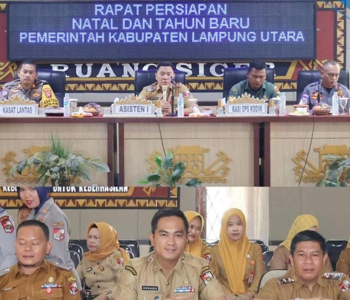 Lampung Utara.sriwijayaPertama.net — Pemerintah Kabupaten Lampung Utara menggelar rapat koordinasi persiapan pengamanan Natal dan Tahun Baru (Nataru) di Ruang Siger Setdakab, Senin. Rapat dipimpin oleh Asisten I, Drs. Mat Soleh, M.Pd, mewakili Bupati Lampung Utara, dan dihadiri Kasat Lantas Polres Lampung Utara, Kepala Dinas Perhubungan Anom Sauni, S.H., M.M., beserta jajaran kepala dinas terkait.