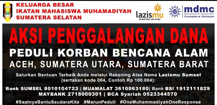 “Kami dari DPD IMM Sumsel akan melaksanakan kegiatan Humanitas sesuai dengan tri Kompetensi IMM untuk turun langsung dalam aksi kemanusiaan dalam membantu meringankan beban saudara – saudara kita di wilayah yang kena musibah,” Ujar Ketua Umum IMM Sumsel, Wahyu Nugroho saat diwawancara awak media, Minggu (30/11/2025).