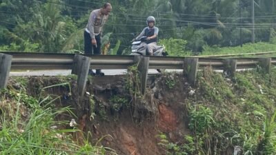 Banyuasin, Sriwijayapertama.net — Bahu jalan di ruas Jalan Lintas Timur (Jalintim) Km 17, tepatnya di sekitar Simpang Kantor Lurah Sukamoro, Kecamatan Talang Kelapa, mengalami tanah longsor. Kondisi ini menimbulkan kekhawatiran akan meluasnya longsoran hingga ke badan jalan nasional yang menjadi jalur utama kendaraan setiap hari.