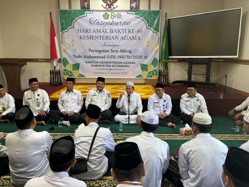 Kotabaru, Kalsel, Sriwijayapertama.net – Kantor Kementerian Agama (Kemenag) Kabupaten Kotabaru melaksanakan Tasyakuran dalam rangka memperingati Hari Amal Bhakti (HAB) ke-80 Kementerian Agama, yang dirangkai dengan peringatan Isra Mikraj Nabi Muhammad SAW 1447 Hijriah/2026 Masehi.