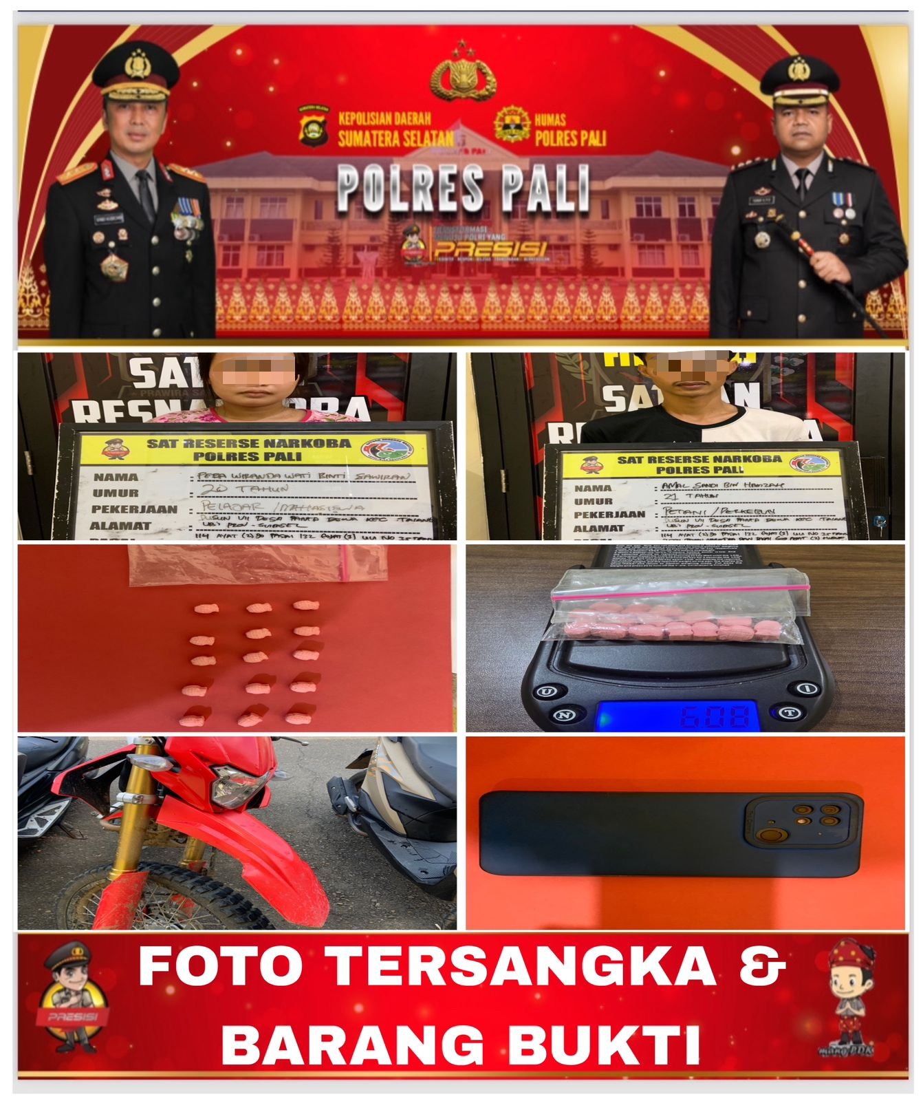 Kedua terduga pelaku tersebut yakni Pera Wiranda Wati (20), seorang pelajar/mahasiswa, dan Amal Sandi (21), seorang petani/pekebun. Keduanya merupakan warga Dusun VII, Desa Panta Dewa, Kecamatan Talang Ubi, Kabupaten PALI. Saat ini, keduanya masih menjalani pemeriksaan lebih lanjut oleh penyidik Satresnarkoba Polres PALI.