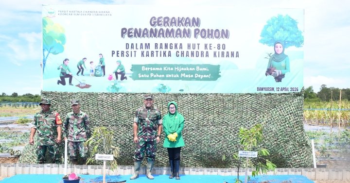 Banyuasin Sriwijayapertama.net – Dalam rangka memperingati Hari Ulang Tahun ke-80 Persit Kartika Chandra Kirana Tahun 2026, Komandan Korem 044/Gapo Brigjen TNI Khabib Mahfud, S.I.P., M.M bersama Ketua Persit KCK Koorcab Rem 044 PD II Sriwijaya melaksanakan kegiatan Gerakan Penanaman Pohon, Minggu (12/4/2026).